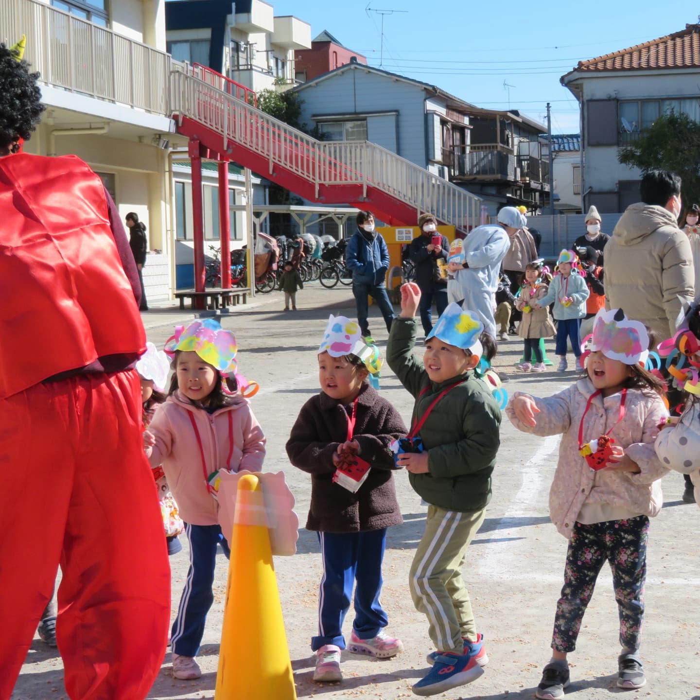 節分のお話しをして、みんなで豆まきを行います。鬼が出てくると怖がる園児もいますが、負けずに「鬼はそとー」