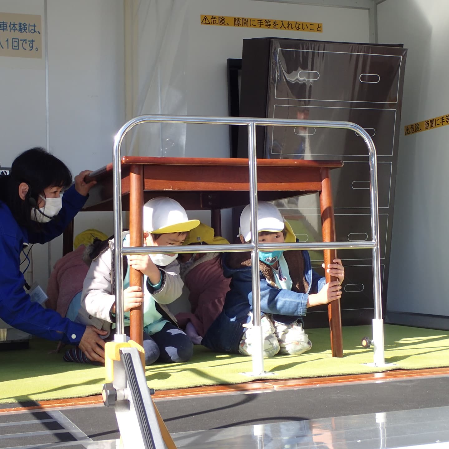 1月の避難訓練では起震車が園庭に登場。全員で地震の体験を致します。保護者の参加も出来ます。